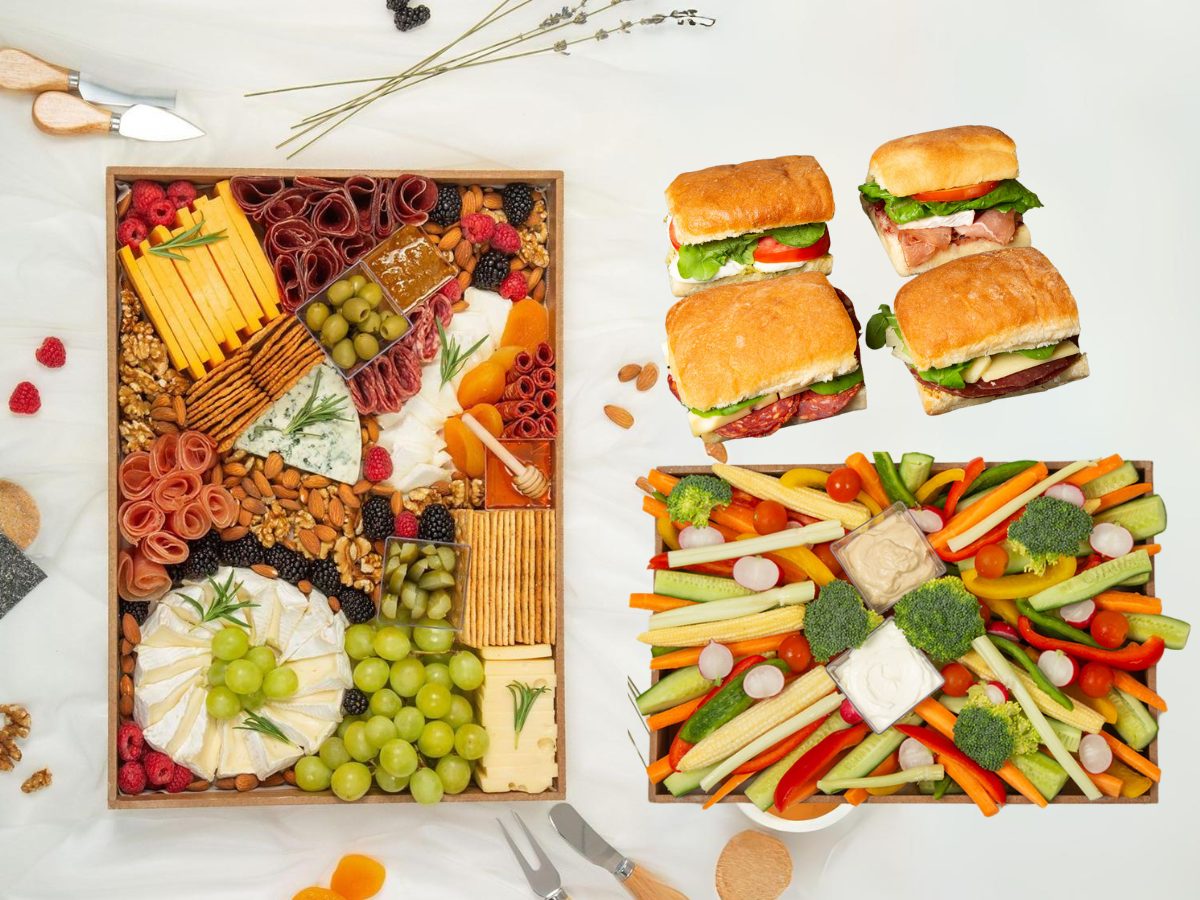 - One appetizer sandwich platter (3 Caprese sandwiches cut in half with pesto, tomatoes, mozzarella, and roca, 3 Salami Piccante & Emmental sandwiches cut in half with spicy salami piccante, emmental, roca & dijon mustard, 3 Beef Bresaola & Parmesan sandwiches cut in half with beef bresaola, parmesan, roca & dijon mustard, 3 Turkey Bresaola & Camembert sandwiches with turkey bresaola, camembert, tomatoes, lettuce & cranberry sauce).