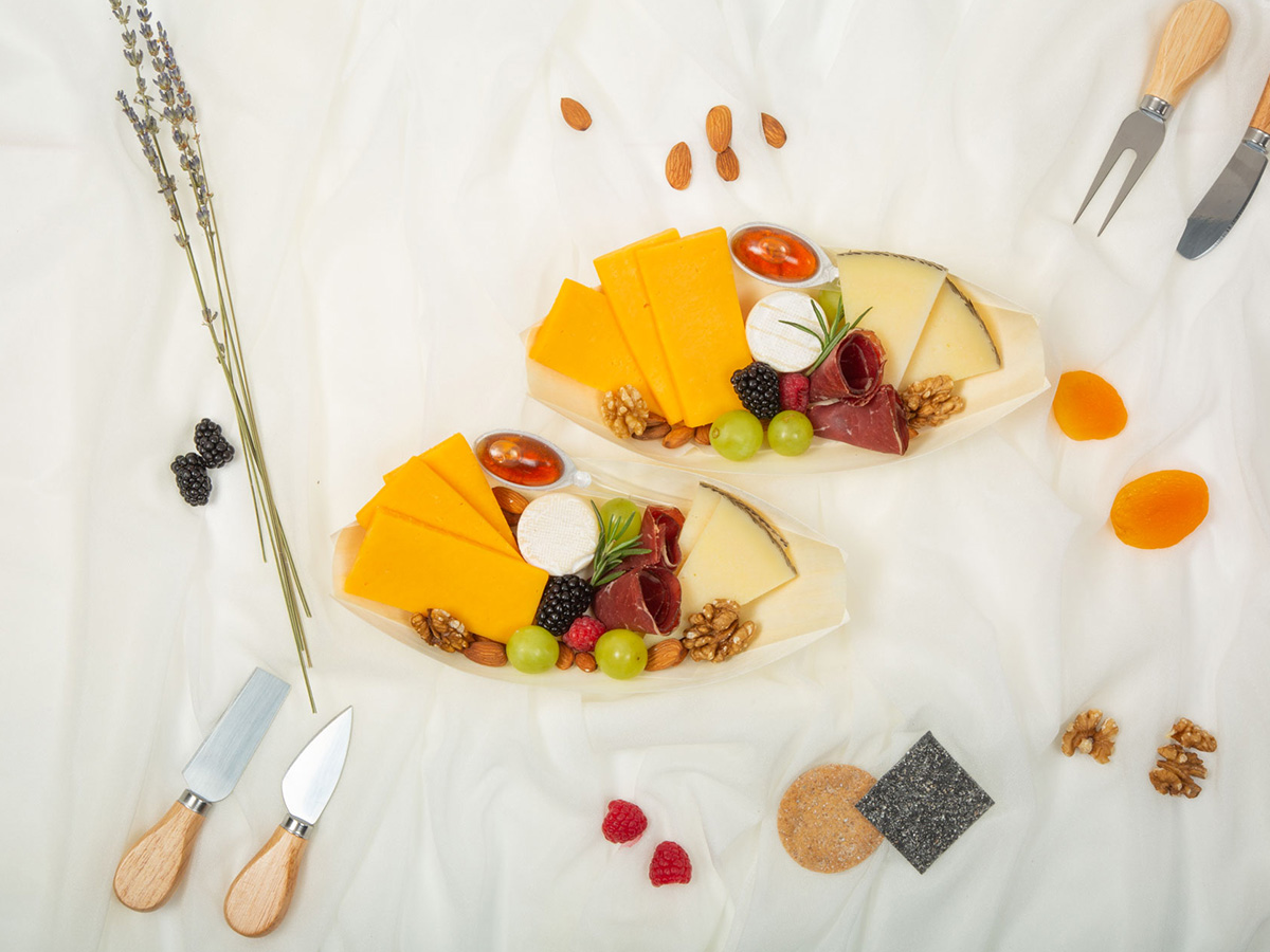 A mix of cheese, charcuterie, fruits, crackers, nuts and a honey stick!