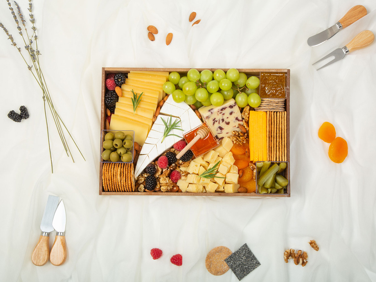 Fruits & Nuts: Raspberries, Blackberries, Figs, Seedless Green Grapes, Dried Apricots, Roasted Walnuts & Almonds.